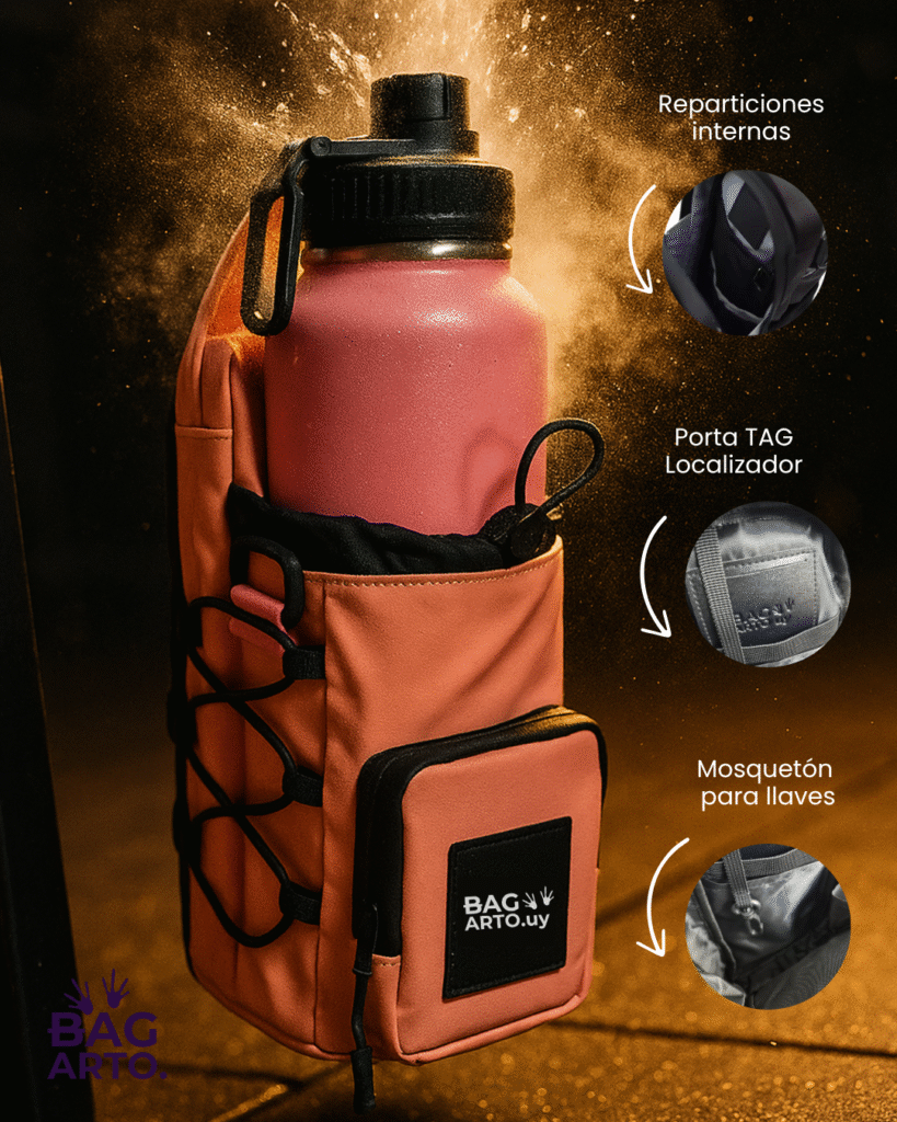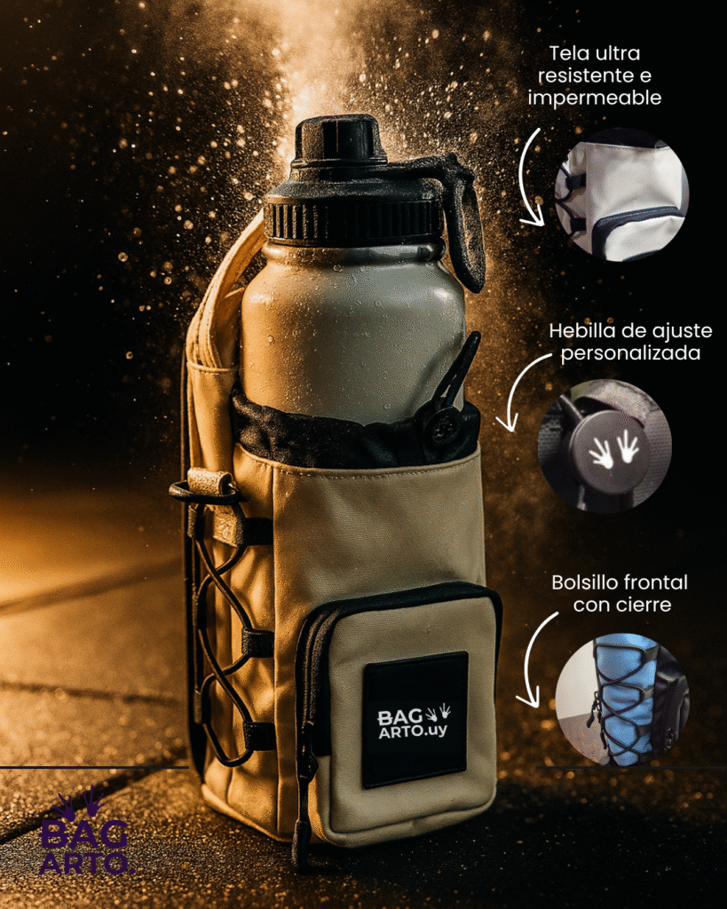 - Portabotella con aislación térmica y hebilla de ajuste personalizada para ayudar a mantener la temperatura de tus bebidas